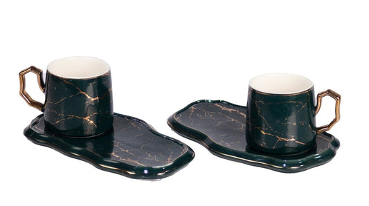 Kezevel Green and Golden Glazed Marble Finish Porcelain Cup with Porcelain Oblong Saucer- Set of 2