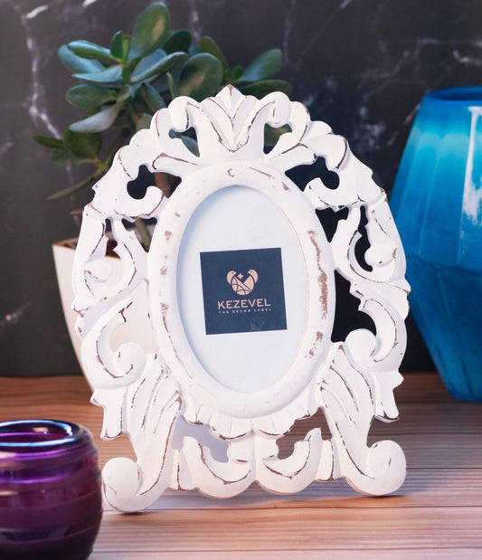 Kezevel Wooden Carved Photo Frames - Artistic Oval Photo Frame in Antique White Finish for Picture Size 4X6 inch, Picture Frame Size 22.86X1.5X27.94CM