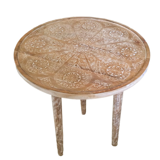 Kezevel Wooden Decorative Accent Table - Round Brown White Handcrafted Vintage End Table, Bedside Table, Side Stand, Size 45.72X45.72X55.88 CM