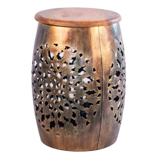 Kezevel Metal Decorative Accent Table - Handcrafted Stool cum Side Table in Antique Gold Finish with Wooden Top for Home Decor, Size 31.8X31.8X43.8 CM
