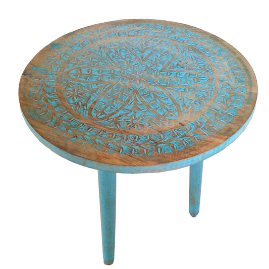 Kezevel Wooden Decorative Accent Table - Round Brown Blue Handcrafted Vintage End Table, Bedside Table, Side Stand, Stool, Size 45.72X45.72X48.26 CM