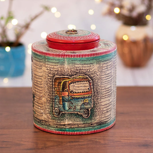 Kezevel Wooden Decorative Storage Box - Cylindrical Antique Multicolor Handcrafted Trinket Box with Lid, Treasure Box, Table Decor Size 19X19X22 CM
