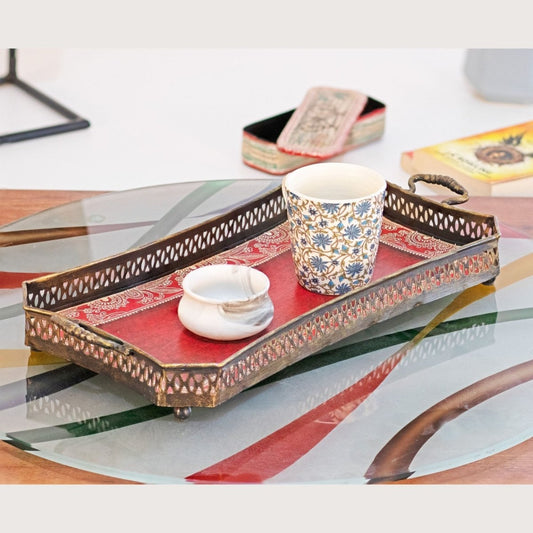 Kezevel Metal Decorative Tray - Artistic Metal Tray in Antique Red & Golden Finish for Table Decor, Dinning Table, Serving Tray, Size 48X22.3X5.5 CM