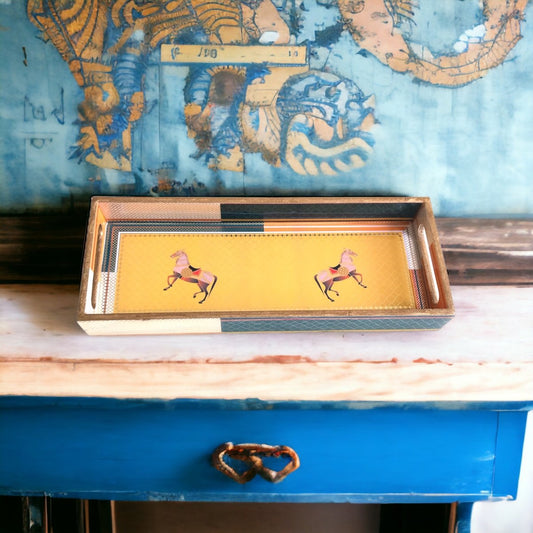 Kezevel Wooden Decorative Tray - Stylish Designer Serving Tray with Horse Pattern for Table Decor, Dinning Table Tray, Size 33.02X12.7X3.81 CM