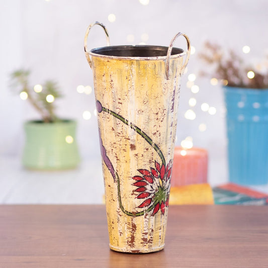Kezevel Metal Decorative Vase - Conical Yellow Antique Distressed Hand Painted Metal Flower Vases for Living Room, Metal Planter, Size 15X15X35 CM
