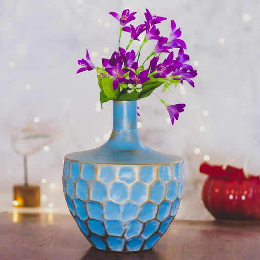 Kezevel Metal Decorative Vase - Golden Blue Honeycomb Pattern Handcrafted Metal Flower Vases for Home Decor, Metal Planter, Size 25.4X25.4X30.48 CM