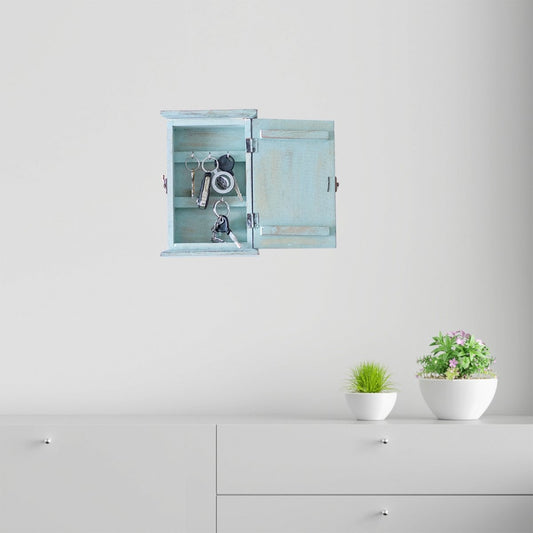 Kezevel Wooden Wall Mounted Key Holder Box - Washed Blue and Brown Handcrafted 5 Hook Key Holder for Wall, Wall Key Holder, Size 17X7.5X25.5 CM