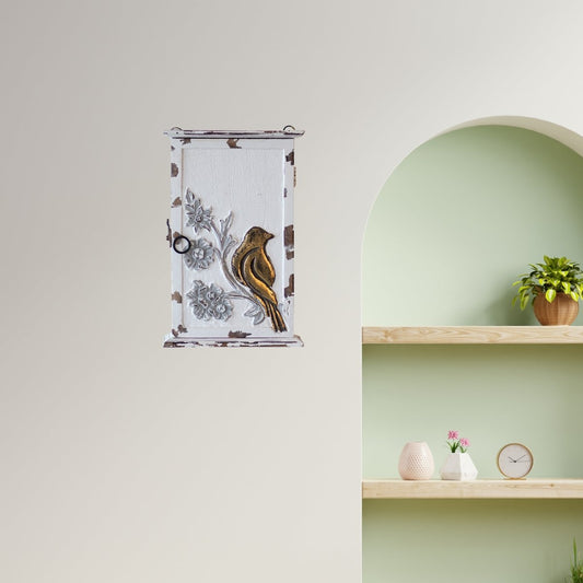 Kezevel Wooden Wall Mounted Key Holder Box - White, Gold, Grey Handcrafted Distressed Finish 5 Hook Key Holder for Wall Designer, Size 20X8X30.5 CM