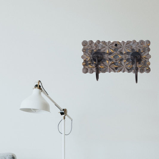 Kezevel Wooden Decorative Wall Hook - Artistic Decorative Wall Hangers in Grey and Gold Finish , Decor Hooks for Wall , Size 19.5X8.5X12 CM