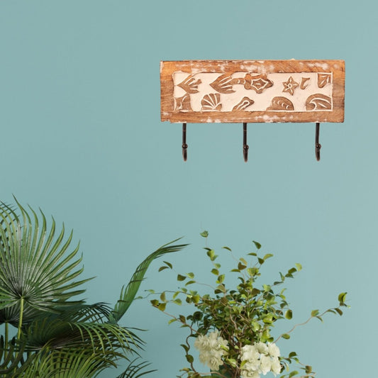 Kezevel Wooden Decorative Wall Hook - Artistic Mango Wood Decorative Wall Hangers in Brown and White , Decor Hooks for Wall , Size 30.48X6X16.5 CM
