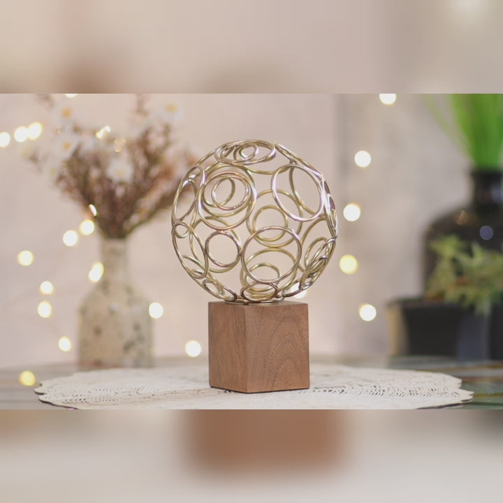 This table decorative showpiece features steel wire rings ball sculpture atop a wooden rectangular base looking stunningly beautiful with its golden finish giving it a modern rich look which adds elegance and stature to your decor.